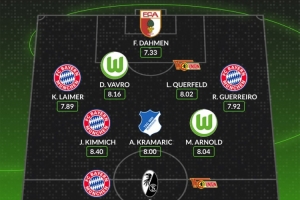 体育资讯4月21日讯 德甲第30轮全部战罢,数据网站Whoscored盘点了本轮比赛评分最高阵容,其中凯恩领衔锋线、基米希、克拉马里奇在列,具体如下: